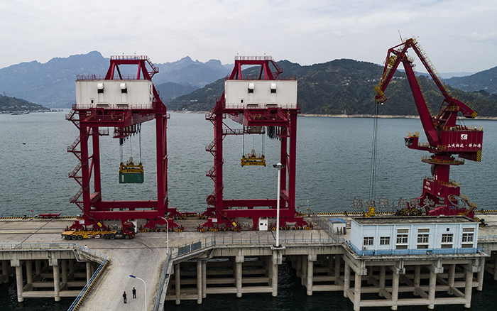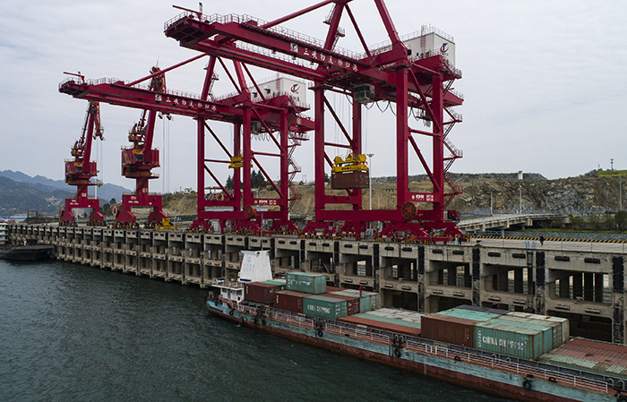 3月17日,在湖北省秭歸縣秭歸港,起重機往貨輪上吊裝貨物(無人機照片)。